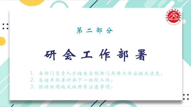 第二个部分为研会工作部署。首先各部门负责人依次发言,对本学期部门具体工作情况进行汇报。随后王莎鑫同学对研会工作进行总结,介绍了研会下一步工作安排,包括协助校研会举办系列活动、准备好就业指导系列讲座等。最后陈亮同学强调了新闻稿撰写及拍摄要求的注意事项。