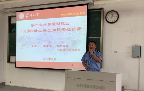 接下来,治安科芈志坚科长为新生们带来了安全知识串讲,讲座在芈科长风趣幽默的自我介绍中展开,一下子调动了现场的气氛。同学们在芈科长的建议下纷纷在手机上关注了东吴安全驿站微信公众号,以便及时了解学校保卫科对校园日常安全注意事项的各项通知提示和教育指导。
