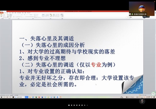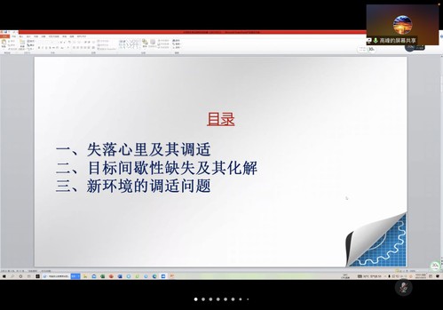 2021年9月23日上午,苏州大学社会学院高峰院长在腾讯会议为2021级新生带来大学第一课。本次会议针对各位新生的学习生活需要,围绕“大学新生常见困惑及其调适”的主题,细分为:失落心理及其调适、目标间歇性缺失及其化解、新环境的调适问题三个方面详细展开。