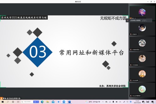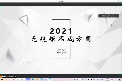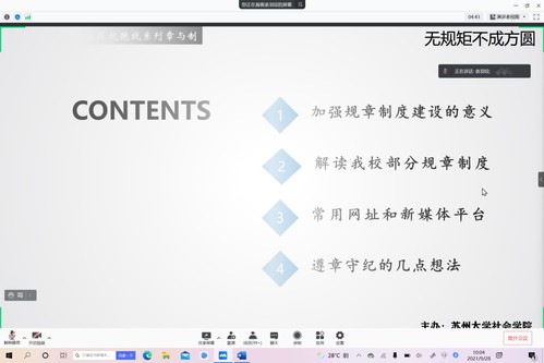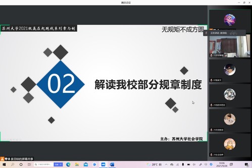 2021年9月28日上午10点,由社会学院团委副书记袁羽琮老师主持的21级新生规章制度讲座以腾讯会议的形式在线上举办。此次讲座旨在提高21级新生对于学校规章制度的认知与理解,构建和谐校园、文明校园、安全校园,促进大学生的健康成长,培养造就高素质人才。