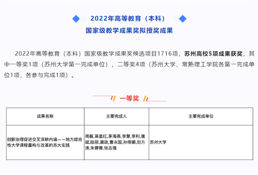 近日,教育部公布2022年国家级教学成果奖获奖名单,社会学院周毅教授牵头申报的成果《创新治理促进交叉深耕内涵——地方综合性大学课程重构与改革的苏大实践》荣获一等奖,这也是本次苏州高校获得的唯一的一等奖奖项。