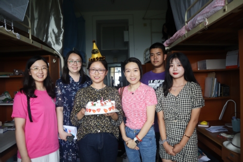 下午,郝书记、马老师、20级新生的班主任老师们分别走访了新生宿舍,并为当天过生日的吕欣桐同学庆祝18周岁生日,为其准备了生日蛋糕与生日礼物。老师们关心来自不同地区的同学,向他们表达慰问,切实了解新生及家长的需求,解答他们的疑惑,缓解新同学来到陌生环境的焦虑与不安感,以更积极的心态迎接即将开始的大学生活。
