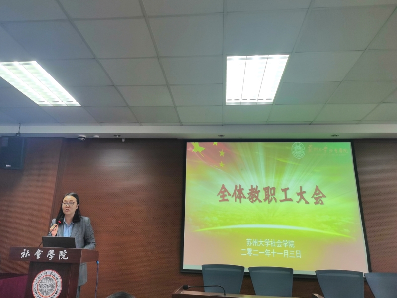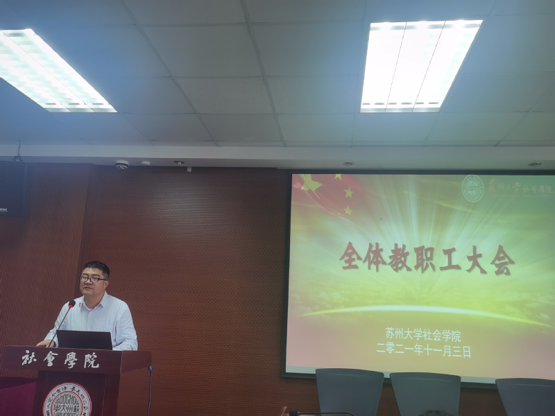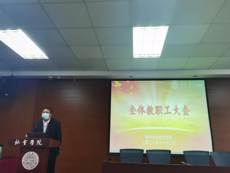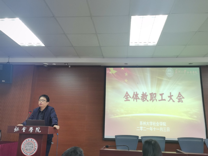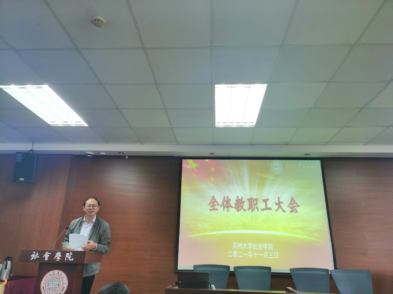 11月3日下午,社会学院在学术报告厅召开本学期第二次教职工大会。院长高峰,党委书记邓国林,副院长黄鸿山,副院长宋言奇,副院长裔洪根,党委副书记、副院长郝珺出席本次会议,学院全体教职工参加会议。会议由党委书记邓国林主持。