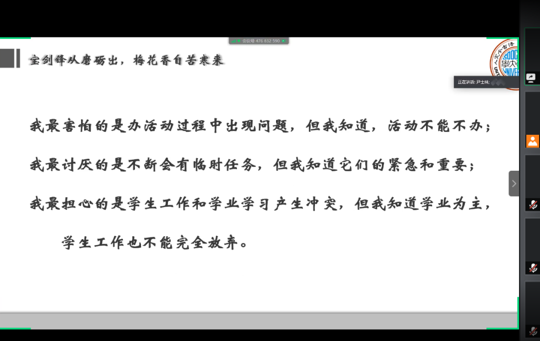2020年5月30日18:30分,社会学院组织各班团干部召开题为“圆梦青春不悔,筑梦砥砺前行”的梦想公开课,以线上形式在腾讯会议进行,主要由16级社会保障专业的学长尹士林分享了自己大学的学生工作和学习经验。