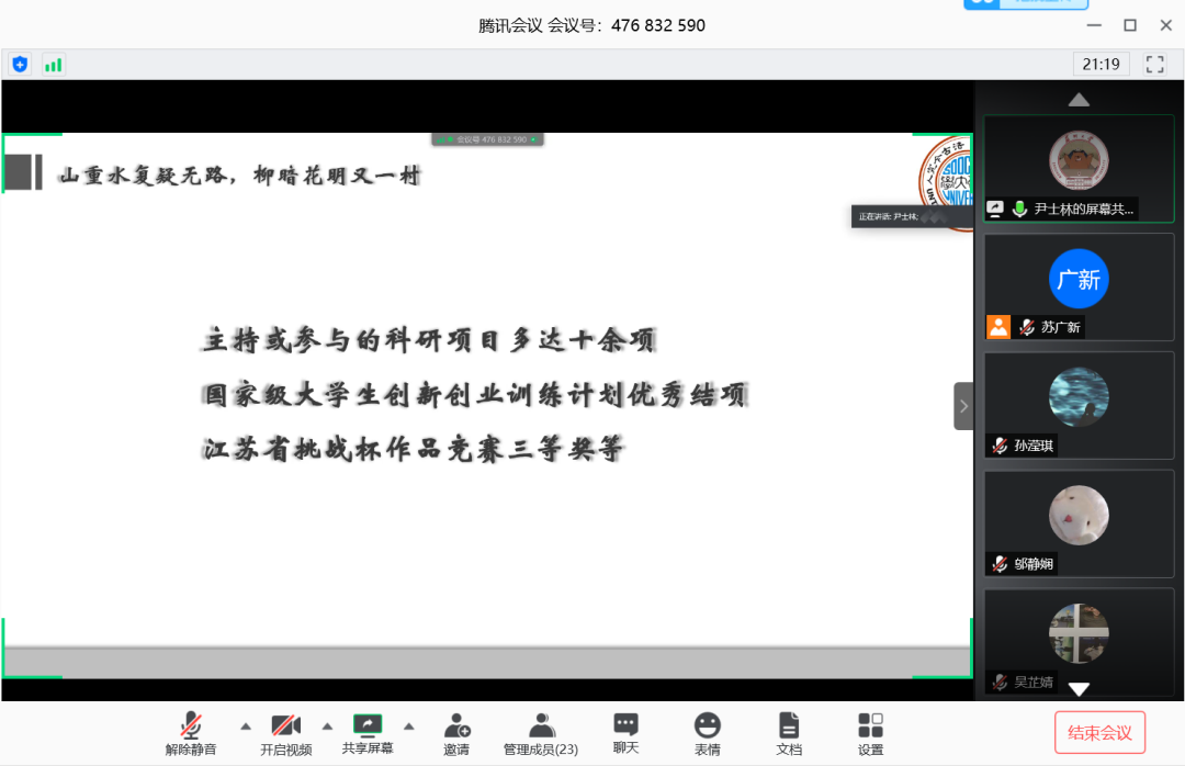 本次活动由社会学院团委副书记苏广新同学担任线上会议主持人,简要阐述了本次活动的主旨:通过尹士林学长的经验分享,给班团干部在学生工作,科研项目和保研经验方面一些指导,帮助班团干部更好的做好学习工作的同时平衡自己的学业。尹士林学长在大学期间,积极参与学生工作,长时间参与志愿工作,主持参与十多项科研项目,获得国家级大学生创新创业训练计划优秀结项,江苏省挑战杯作品竞赛三等奖等荣誉。学长将本次分享分成了三个部分。