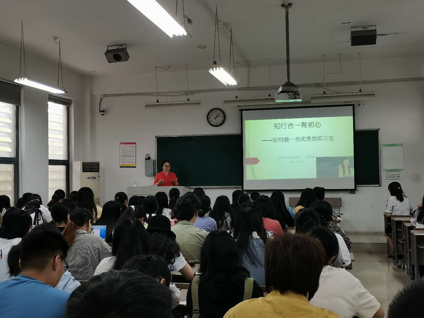 俞老师围绕“如何做一名优秀的实习生”这一主题,讲解了实习生的角色意识、学习目标以及学习任务等内容,并结合自己的任教经历以及相关材料,条理清晰地为同学们展现了一个优秀的实习生的核心要求。同时,俞老师也对即将踏入实习生岗位的同学们寄予殷切的希望:希望同学们在实习生涯里可以融入真实的校园生活,并且做个有追求的小老师。