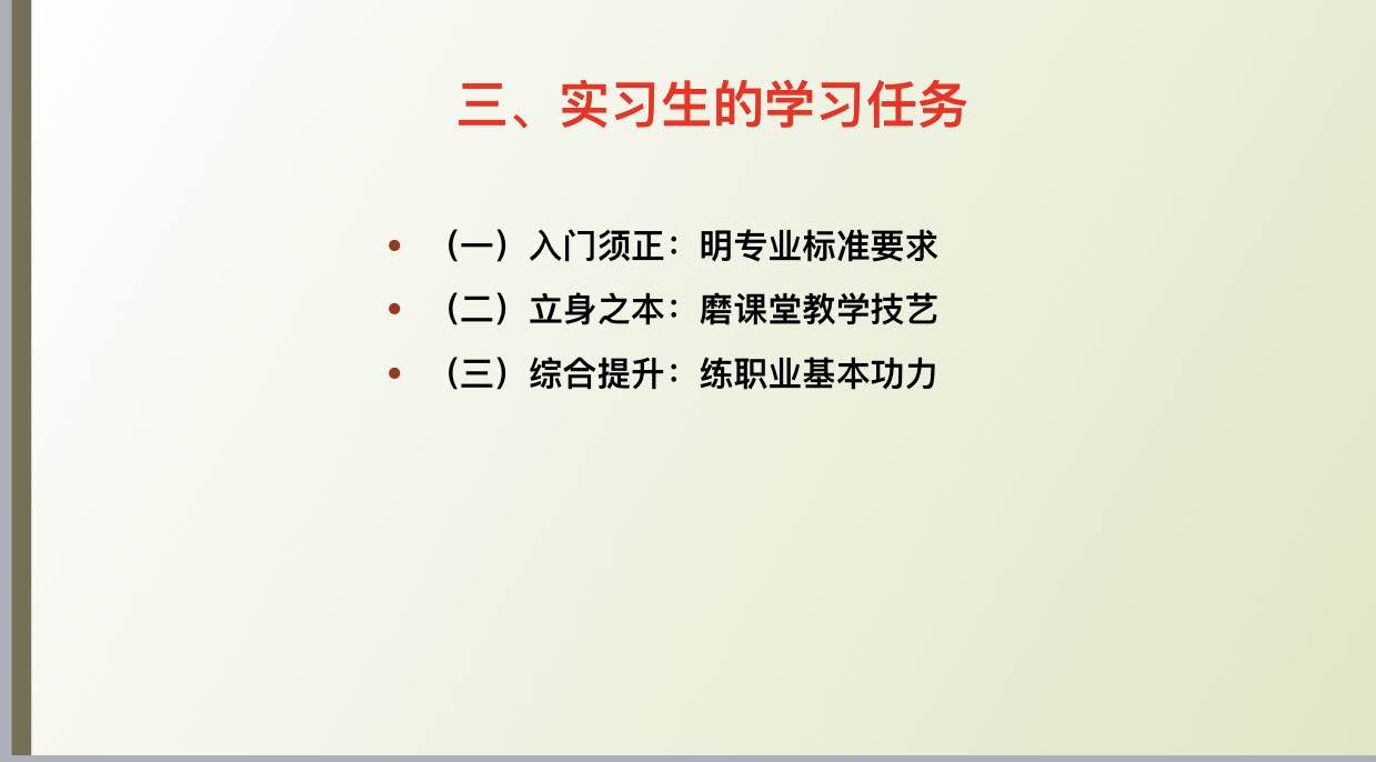 俞老师讲述了实习生的具体目标。一个好的实习生,必须在德、能、勤、绩等一般目标方面有所表现;个人目标方面,需要达到巩固知识、熟悉工作、提升能力、培养态度、锻炼精神等基本目标,并努力向“学做好老师”的高级目标迈进。俞老师勉励即将实习的同学们,在实习的过程中一定要擦亮眼睛,做事做人要向“道德教师”、“反思型的实践家”、“课程领导者”等这样的好老师看齐。