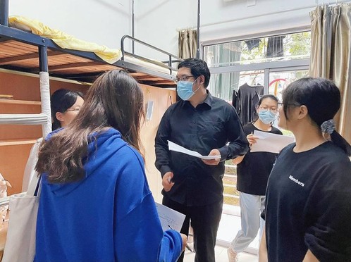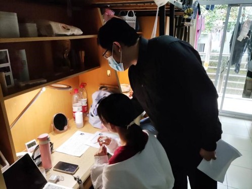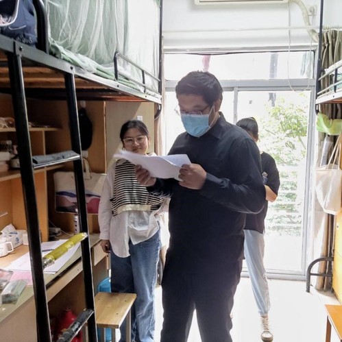 首先,一行人来到独墅湖一期207的三号楼梯,检查了207的115宿舍,袁老师根据学校的防疫要求,询问同学们是否预约核酸检测,是否准备口罩等防疫物品,并希望同学们能够严格遵守学校防疫规定。