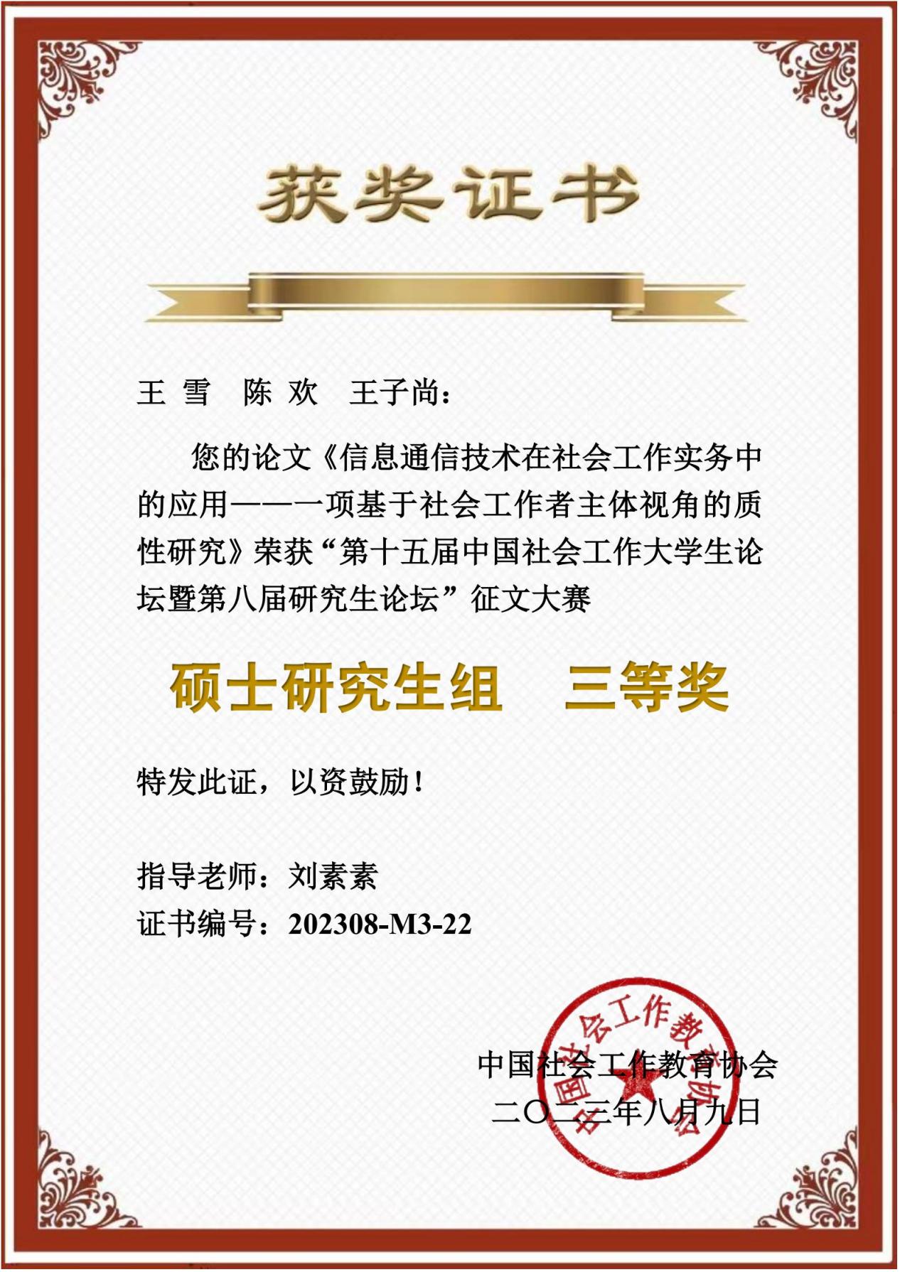 苏州大学社会工作专业硕士研究生王雪、陈欢、王子尚依托对22位苏州社会工作者的深度访谈,完成了“信息通信技术在社会工作实务中的应用——一项基于社会工作者主体视角的质性研究”一文,由陈欢同学在分论坛进行汇报,获得此次论坛三等奖。与此同时,苏州大学社会工作专业硕士研究生吴香怡以“发展资源对心理健康的影响——第一代与非第一代大学生差异分析”一文同样入选并参与线下发言。