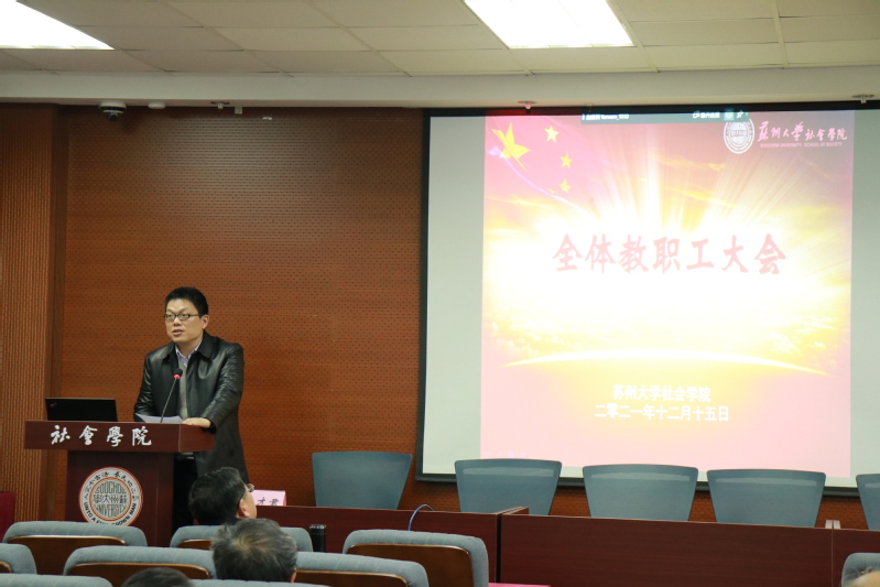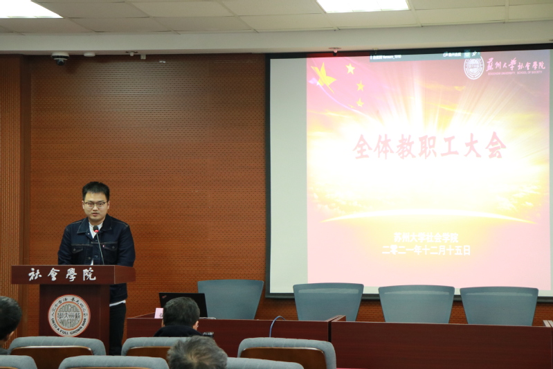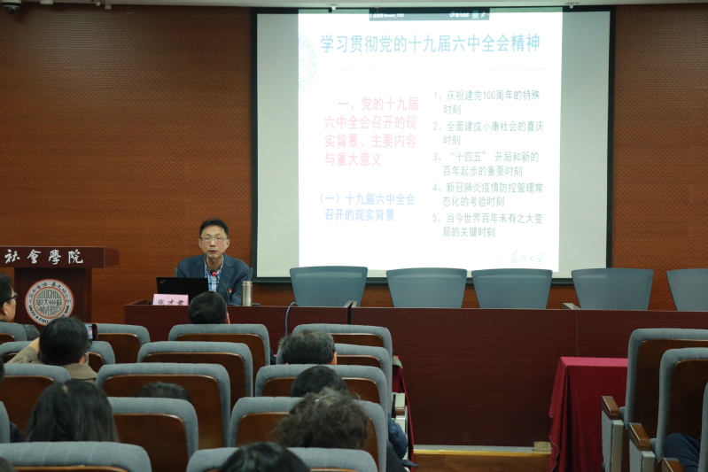 为深入学习贯彻党的十九届六中全会精神,与时俱进开展好党史学习教育,12月15日下午,社会学院在学院学术报告厅召开了2021年秋季学期第三次教职工大会暨十九届六中全会精神辅导报告会。本次报告会由苏州大学学习宣传贯彻党的十九届六中全会精神宣讲团成员张才君教授主讲,社会学院领导班子及全体教职工出席。会议由社会学院党委书记邓国林主持。