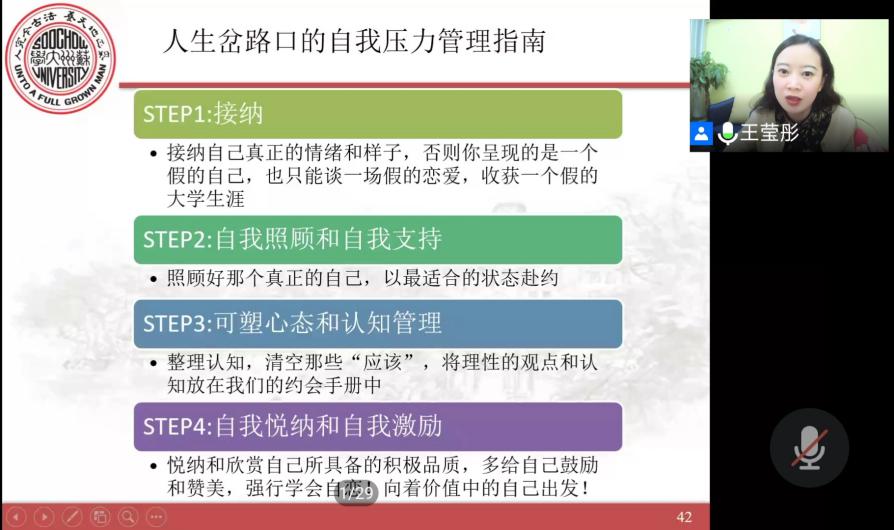 2020年11月4日18时30分,社会学院17级毕业生心理讲座通过网络直播的形式进行。苏州大学心理老师王莹彤为毕业生们解忧就业心理。
