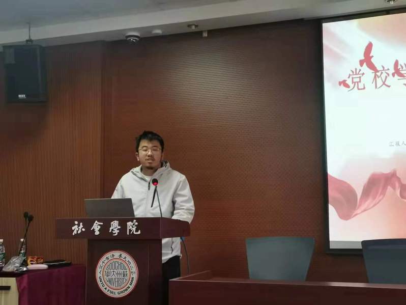 接着,本期培训班优秀学员代表龙超腾同学上台发言。他回顾了本学期参加培训班的学习经历,并结合社会学专业理论讲述党史学习成果。他决心在今后学习中补足短板,锤炼作为中国青年的志气、骨气和底气,不负党和人民的殷切希望,以青春蓬勃朝气的姿态在为他人服务中担当使命。