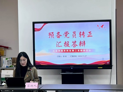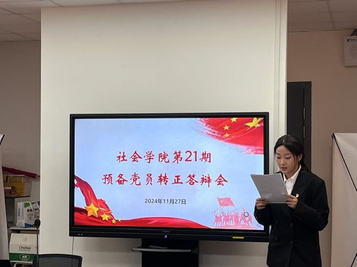 为加强高素质学生党员队伍建设,进一步增强对预备党员的培养、教育和考察,提高党员发展质量,根据《江苏省大学生党员发展工作“三投票三公示一答辩”实施办法》要求,11月27日下午,社会学院第二十一期预备党员转正答辩会在学院党建会议室举行。学院党委书记邓国林、党委副书记兼副院长朱今、专职组织员李玲、团委副书记兼研究生第四党支部书记朱星洁、本科生第二党支部书记孙柏林、研究生第一党支部书记邵至央出席活动。各学生党支部书记、预备党员代表参加活动。活动由2023级信息资源管理专业范芷瑜同学主持。