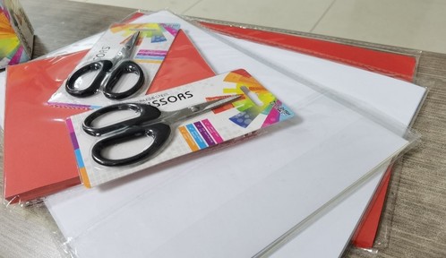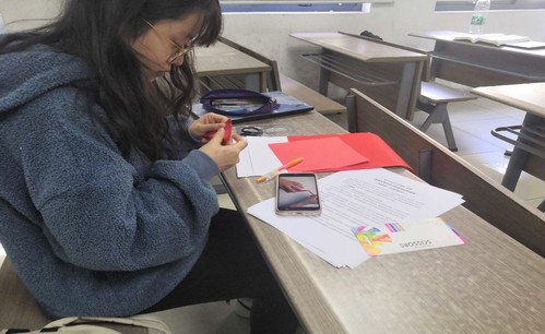 准时安排就绪后,每位参与活动的同学分发到一份剪纸材料:红纸、剪刀、固体胶、白纸。活动主持人孙亿洲、韩欣谕简单讲述裁剪方法,在大家构思想法后,用剪刀与红纸裁剪下自己设计的图案,经由固体胶粘贴上白纸,一副简单而精美的作品便跃然纸上。