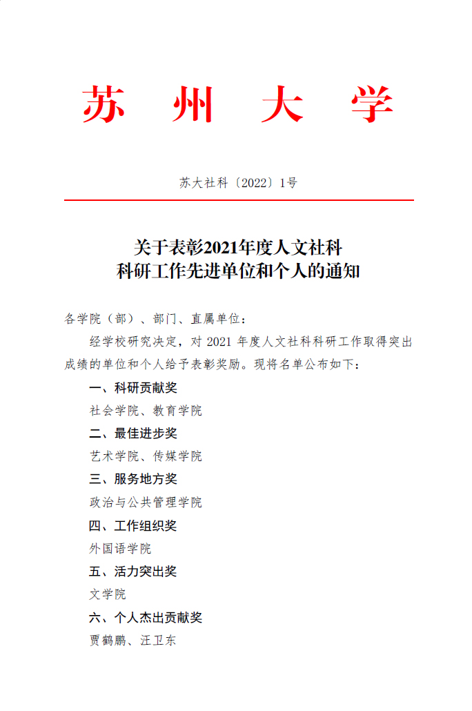 2021年,社会学院全体师生在校、院党委行政的领导下,在各部门单位的支持与配合下,围绕学院中心工作,齐心协力,奋发作为。今年,社会学院荣获人文社科科研贡献奖,高峰院长作为代表上台领奖。今年成绩的取得,是全体师生迎难而上、共同努力的结果,也是广大校友和社会各界朋友们大力支持的结果,在此谨向大家表示衷心感谢和崇高敬意!在2022年,学院将继续扎实推进各项重点工作,力争在教学科研方面取得更多进步。