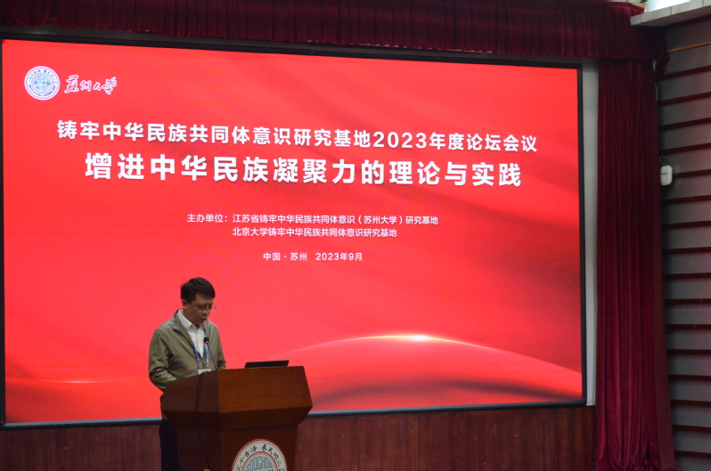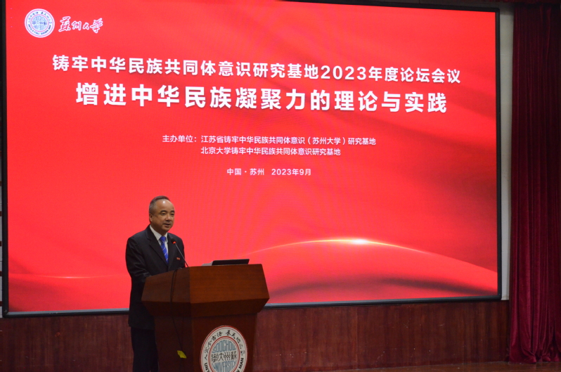 9月23日至24日,由江苏省铸牢中华民族共同体意识(苏州大学)研究基地和北京大学铸牢中华民族共同体意识研究基地共同主办的“中华民族共同体意识研究基地2023年度论坛”在苏州大学红楼会议中心举行,论坛主题为“增进中华民族凝聚力的理论与实践”。苏州大学党委常委、副校长查佐明、国家民委理论研究司智库处处长刘元如出席会议并致辞,潘志平、姚大力、马戎三位著名学者作大会主旨发言,江苏省民宗委巡视员、民族一处处长鲍蜀生及民族一处其他领导、苏州市民宗局及苏州大学相关院部领导出席,在苏高校统战系统干部、苏州大学相关院系辅导员和师生列席。