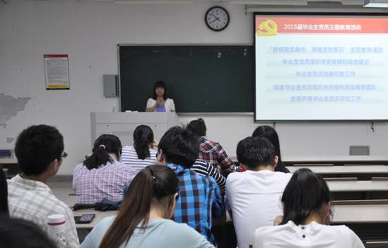 董娜简要介绍了习近平总书记协调推进“四个全面”战略布局思想,首次提出了“全面从严治党”,体现了治标和治本的统筹兼顾,自律与他律的双管齐下。之后她以守纪律讲规矩为关键词,结合毕业生党员工作分三个方面进行了解读:一是用情开展好毕业生党员主题教育系列活动,通过理论培训与志愿服务增强党性观念;二是用心执行好毕业生党员组织关系转移,通过规范填写与及时转移珍视党员身份;三是用功学习好《中国共产党章程》和党的基础知识,通过端正态度与自觉学习树立政治意识。 讲课过程中,董娜希望毕业生党员要特别重视自己的党员组织关系转移、党员档案管理、党员信息登记等工作,要自觉强化党员意识,牢记党员身份。院党委的每位老师也会全心全意为每位毕业生党员提供优质的教育管理和服务工作,更希望党员同志能够认真审核毕业入党积极分子的培养考察材料,协助学院做好文明离校、安全离校的各项工作,在守纪律、讲规矩上作表率,做先锋,深入同学中间,无私奉献,站好最后一班岗。
