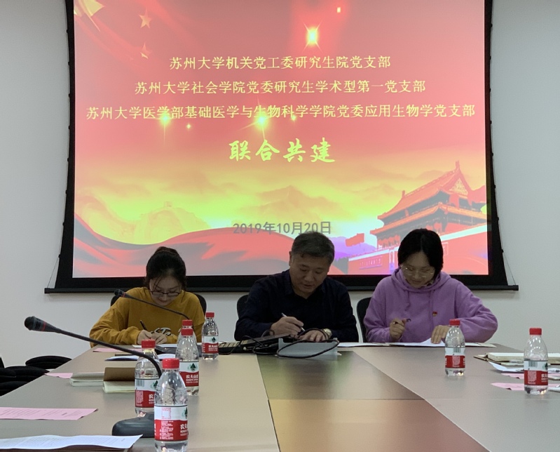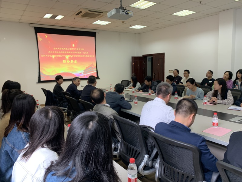 2019年10月20日上午,社会学院党委研究生学术型第一党支部联合共建活动在苏州大学独墅湖校区一期403幢3119室举行,本次活动由研究生院党支部书记赵一强主持,研究生院院长曹健、党委研究生工作部部长吴雪梅、医学部基础医学与生物科学学院党委书记沈学伍、社会学院党委书记邓国林出席共建活动,研究生院党支部、社会学院党委研究生学术型第一党支部、医学部基础医学与生物科学学院党委应用生物学党支部全体党员参加了本次活动。