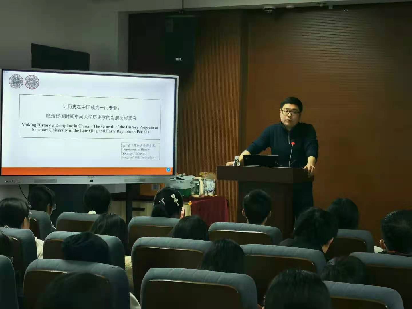 2020年11月25日14时,社会学院青年海归学者专题讲座于独墅湖校区二期的1005-5448社会学院学术报告厅举办。本次活动邀请到苏州大学历史学系王晗老师分享主题为《让历史在中国成为一门专业:晚清民国时期东吴大学历史学的发展历程研究》的讲座,社会学院学工办主任、19级20级辅导员马竞飞出席本次活动。社会学院2019级、2020级历史学(师范)专业全体本科生参与了此次活动。