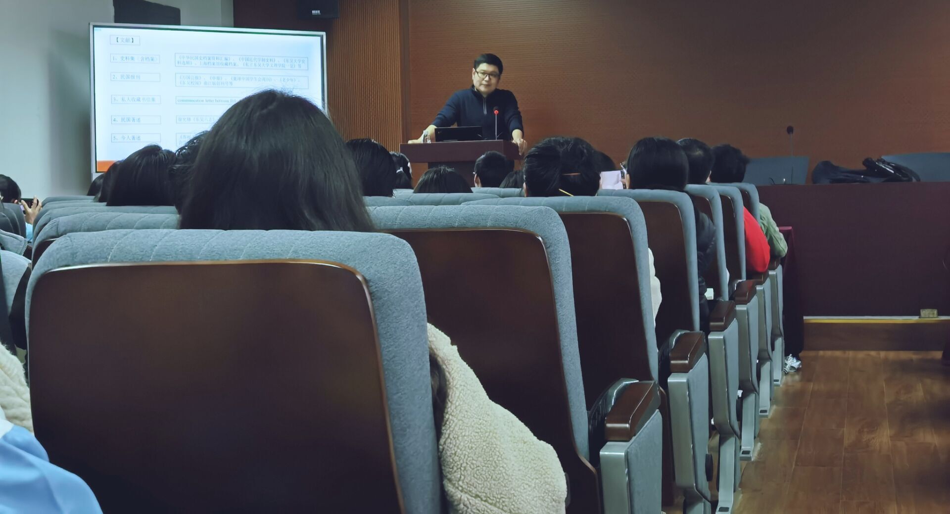 首先,王老师首先介绍了本次报告所涉及的文献资料,其中包括《中华民国史档案资料汇编》、《中国近代学制史料》、《东吴大学史料选辑》、上海档案馆收藏档案、《万国公报》、《申报》、《寰球中国学生会周刊》、《老少年》、《东吴校闻》、《东吴六志》和《青峰学记——柴德赓教授纪念文集》等。在广泛占有资料的基础上,王晗老师提出三个学术问题:1、东吴大学办学时期有没有历史学课程?有没有历史学科?有没有历史学系?2、东吴大学办学时期历史学(以下称东吴史学)的发展轨迹是怎样的?3、为什么在中华人民共和国成立初期的院系调整中无法看到东吴史学的独立存在?