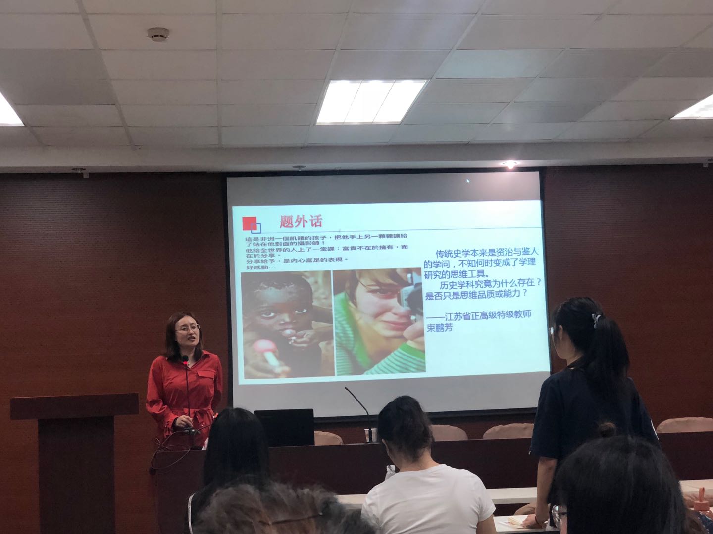 作为苏州市历史学科带头人,朱海蓉老师结合多年教学经验以及教科研心得,向与会师生分享了她对于“新课程背景下的中学历史教师应该如何适应与发展”这个问题的看法。朱老师主要是从三个方面,即新的形势与困惑、新的适应与发展以及新的理想与达成展开她的讲座的。