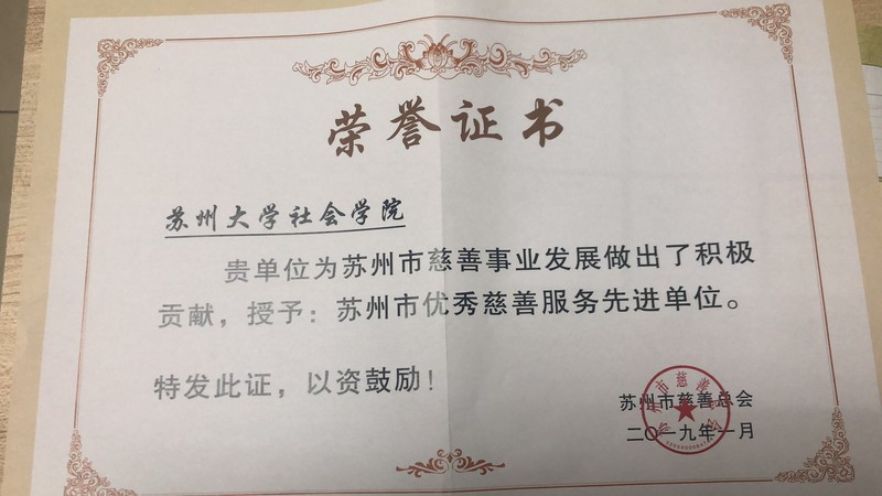 社会学院以为苏州市慈善事业发展做出的积极贡献,荣获由苏州市慈善总会颁发的“苏州市优秀慈善服务先进单位”奖。