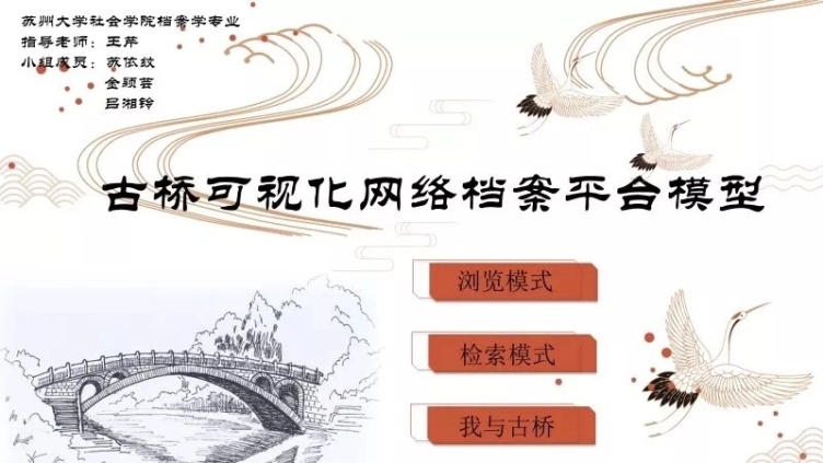 苏州大学档案学专业团队的作品主题是“桥之情,心之案——苏州古桥可视化云端建档构想模型”,作品旨在以纪录片的形式讲述团队在苏州甪直、同里为古桥实地建档的过程中的所见所闻与古桥档案网络平台的功能设计。受时下大热的文博探索节目《国家宝藏》的启发,作品视频是以未来一百年后的一期《国家宝藏》节目为舞台,以一种虚构想象的形式来倒叙介绍,展现古桥档案网络平台的功能及其前世今生的故事。