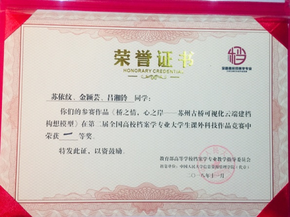 2018年11月3日,由教育部高等学校档案学专业教学指导委员会主办的“第二届全国高校档案学专业大学生课外科技作品竞赛”全国决赛,在南昌大学隆重举办。我院档案学专业学生团队以苏依纹、金颖芸、吕湘铃等3位同学为代表,在指导教师王芹副教授的带领下,通过全国初赛,成功入围决赛。来自全国14所高校的15支团队的优秀作品在会上展开精彩而激烈的角逐,最终,我院档案学专业团队作品“桥之情,心之岸——苏州古桥可视化云端建档构想模型”顺利斩获一等奖,载誉而归。