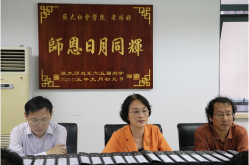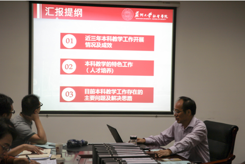 王卫平院长从三个方面汇报了社会学院本科教学工作审核评估的具体情况:一是近三年本科教学工作开展情况及成效,运用详实的数据展示了社会学院在教学工作上取得的成绩;二是本科教学的特色工作,即着力构建“6+1”课堂育人体系,积极探索一专多能,外向复合型人才培养长效机制;三是目前本科教学工作存在的主要问题及解决思路。