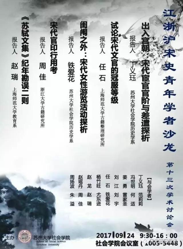 2017年9月24日,江浙沪宋史青年学者沙龙第十三次学术讨论会在苏州大学社会学院举行,共有江浙沪地区的十余名青年学者参加。会议伊始,大家交流了近来学术工作的进展和心得。随后进入了学术报告的环节。此次会议有五位学者提交了作品。