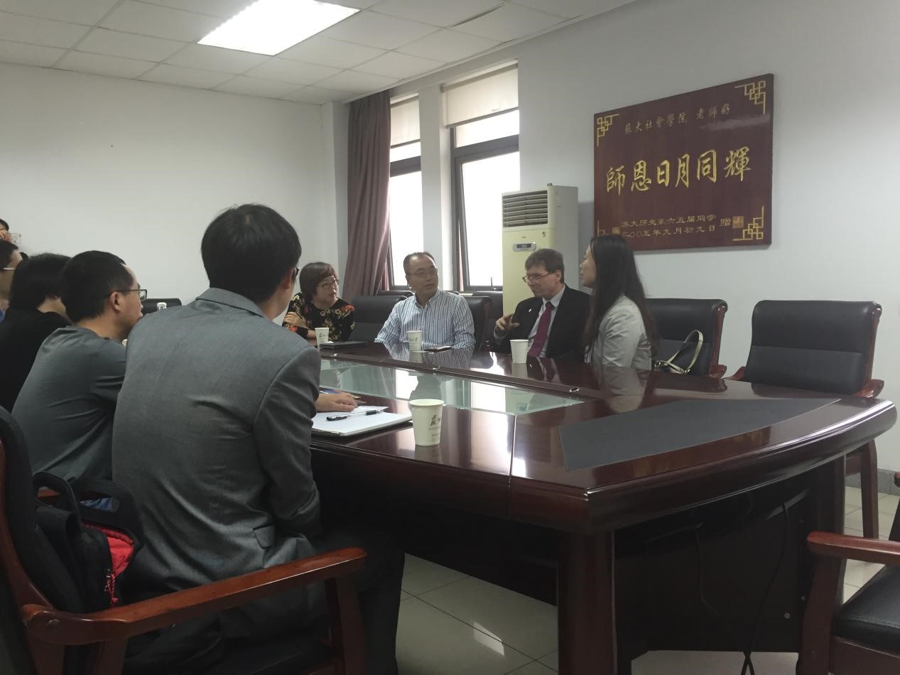 在报告会开始之前,档案与电子政务的教师与唐尼教授进行了将近一小时的交流活动,双方介绍了各自专业的情况,并就未来双方学生交换,赴美考研和攻读博士学位等问题进行了交流,教师与唐尼教授全英文互动交流得十分顺畅,使得档案与电子政务系在国际化的进程中迈出了坚实的一步。