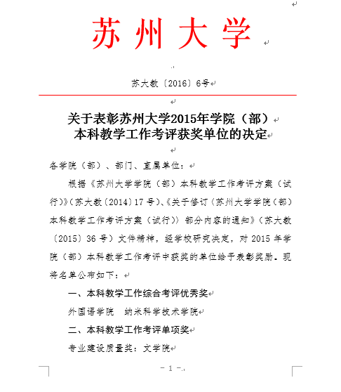 社会学院在苏州大学2015年本科教学工作考评中获课程建设推进奖