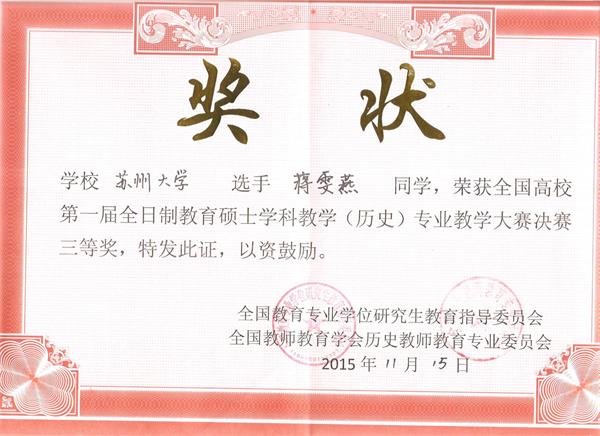 “全日制教育硕士学科教学(历史)专业教学技能大赛”旨在展示全日制教育硕士的培养成果,促进院校交流,提高培养质量。本次大赛分初赛和决赛两个环节,来自全国43所高校的210名选手参加了初赛,从中决出84名选手参加决赛。苏州大学社会学院蒋雯燕、韦茜同学在初赛中获得“优秀教学设计奖”。并在此基础上,在决赛中与北京师范大学、东北师范大学等名校同学同台角逐,在得奖率不高的情形下,俩人均荣获三等奖的佳绩。