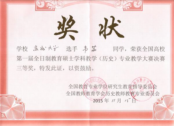 本次比赛,既是对学科教学(历史)专业硕士的激励,也是对学科教学(历史)专业硕士培养的检验。我校两名学生得以拿回四张获奖证书,不仅是指导教师和参赛学生辛勤付出的收获,更是我校专业学位研究生培养的累累硕果的表现。