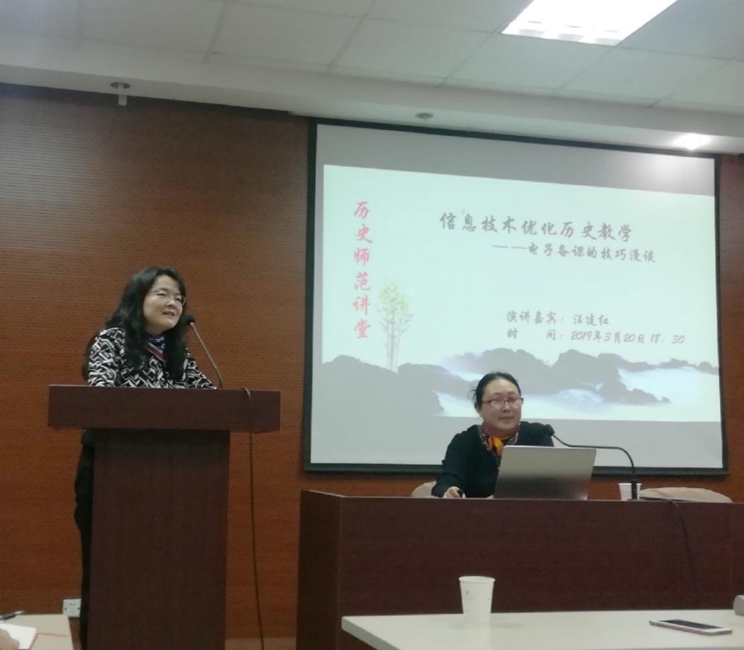 2019年3月20日晚,江苏省苏州市第十中学高级教师、苏州市学科带头人汪建红老师应邀在苏州大学社会学院历史系作了《信息技术优化历史教学一一电子备课的技巧漫谈》为题的学术讲座。讲座由历史系主任铁爱花教授主持,历史系崔恒秀、冯世明、范莉莉等老师以及历史系本科生、硕士生共50余人参加。在讲座正式开始前,历史系主任铁爱花教授为汪建红老师颁布聘书,聘请汪老师为苏州大学历史系师范生技能校外导师。