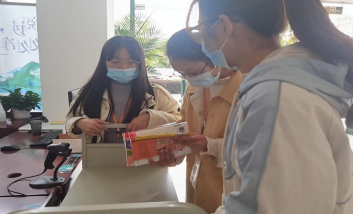 接着,学员们开始了志愿服务。一位同学负责在门口帮忙测量体温并且确保进入图书馆的人员都佩戴了口罩;一位同学负责在自助借还机旁帮忙借还图书;三位同学负责分类整理好还回的图书,并将它们放到指定的书架;另外两位同学负责在电脑前借助电子信息化功能来查看图书是否在库,以便更好满足前来借阅图书的人员的要求。过程中,同学们认真负责,做好自己被分配到的任务,遇到一些疑难便向工作人员请教,工作人员耐心为同学们解答,帮助同学们顺利完成任务。