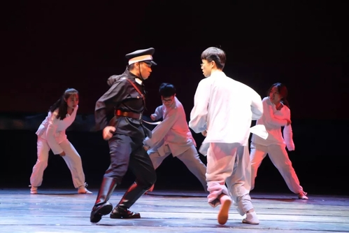 社会学院表带来的舞蹈《南城哨》讲述了共产党与军阀斗智斗勇,几经周旋,最终成功送出情报的故事。表演起始,共产党员在护送情报的途中遇到了前来拦截的军阀。在紧张的氛围中,军阀与共产党情报人员经历好几次激烈交锋,光影明灭间,舞者的身躯在其中有力跃动着,暮色中的尖锐对决让观众们看得胆战心惊。