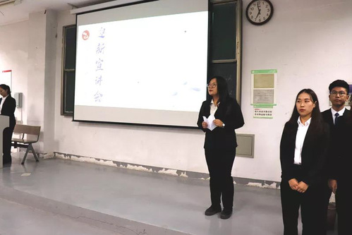 接着,晚上六点半,面试教室准备活动告一段落,招新宣讲会正式开始。社会学院学生会在第二个进行宣传,由王莎鑫同学作为学生会代表进行宣讲。为了让社会学院19级新生初步了解学生会,王莎鑫同学先简要介绍了各个部门的工作职能和日常工作内容,也展现了院学生会的和谐氛围,学生会工作人员还播放了招新宣传相关视频。随后,各部门成员按照顺序一一上前鞠躬亮相,向新生们致意。最后,在场的各位学生会成员一起喊出口号“因为热爱,所以专注,我们不见不散”,充分展现出了学生会的风采,以及对新生可以积极加入学生会的期待。精彩的展示赢得了新生们热烈的掌声,使其充分了解学生会职能之余,也结合自己的能力,选择心仪的部门。