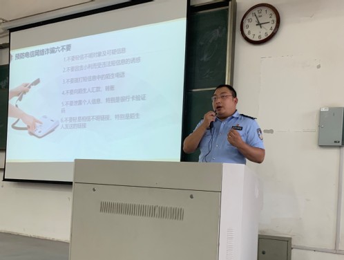 这场关乎同学们最切身利益的讲座在热烈的掌声中拉开帷幕。会议伊始,永安桥派出所的民警就讲到了近年来肆虐猖狂的非法校园贷,他为同学们讲解了各类不同的常见欺骗花样和套路,以及分享了发生在同学们身边的案例。接着,他继续介绍了如网络刷单、冒充公检法进行电话诈骗、网络购物诈骗等常见的诈骗方式,并列举了预防电信网络诈骗六不要准则,令新生们印象和记忆更加深刻,而因不堪贷款重负而轻生的举例又引发了同学们的惋惜和思考。讲座在严肃而不乏轻松的氛围中继续进行,力求达到使同学们树理性消费观念,学会防校园贷款陷阱的效果,台下的新生们紧跟着派出所民警的思路认真记忆。