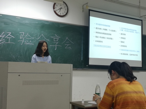接下来是考取中国人民大学图情专硕的吕湘铃学姐,学姐语言风趣、性格直爽,她强调暑假7、8月份的重要性,并指出:方法一定要适用于自己,不能盲目复制别人的做法,要抓住时机,敢于挑战。最后是考取到中山大学图情专硕的赵国双学姐,她详细地为同学们介绍了从择校、资料查找的方法、过程准备、复习规划等内容以及复试的流程和经验教训,同学们听得十分认真。