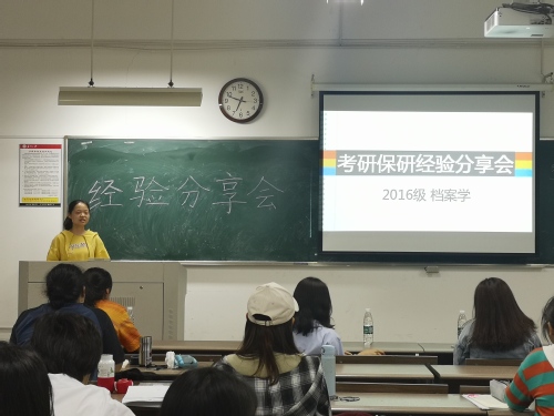 2019年5月27日晚上6点半,苏州大学社会学院2016级档案学班考研保研经验分享会准时开始。为了让同学们在考研保研准备的过程中更加有规划、有思路、有方法,在考研大军中迎难而上、争创佳绩,2016级档案学班特邀请2019届考研成功的15信管的吕湘玲和赵国双学姐以及保研成功的15档案刘贞伶和苏依纹学姐进行经验分享。2016级档案学班、2016级信息资源管理班、2017级档案学班、2018级图书情报与档案管理班的学生参与了本次分享会。