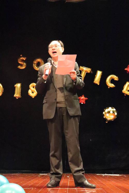 晚会开始,社会学院党委书记邓国林老师首先上台致辞。邓书记表示,“冬至大如年”,冬至意味着团圆与圆满。在过去的一年中,社会学院在学风建设、科创文体方面都取得了不俗的成绩,也期待着社院人在冬至晚会上的精彩表演,为2018年画上一个圆满的句号。