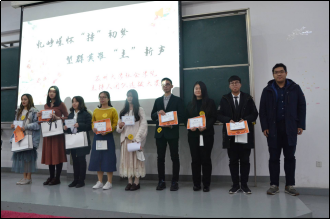 最后,便是观众们期待已久的颁奖环节。首先宣布的是单项奖获得者名单,获得社会学院第一届主持人团队选拔大赛“最佳仪态奖”的是徐蕾同学,获得“最佳控场奖”的是张永庆同学,获得“最美声音奖”的是滚玉明同学,获得“最具人气奖”的是邵至央同学。评委安辰同学为他们颁发奖状奖品并合影留念。接下来宣布的是第四到第八名获得者名单,分别是邵至央、李雯婷、陈以沫、成紫玥、钱正林同学(按名次高低顺序)。评委刘凝同学为他们颁发奖品奖状并合影留念。本次大赛的前三名的获得者是韩诗雨、王晨晖、杨然天同学(按名次高低顺序)。评委范潇予同学为同学们颁发奖品奖状并合影留念。此外,本次大赛的前八名获得者将加入苏州大学社会学院主持人团队,评委袁羽琮老师为八位入选主持人团队的选手颁发聘书并合影留念。