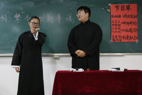 最后张华宇同学与史欣然同学联手带来了反场——北京小调《探清水河》,给我们带来了惊喜。伴随着主持人话“年年岁岁花相似,岁岁年年人不同。经典的相声可以流芳数十年,青春的面孔却是代代更迭……”本次相声迎新专场圆满结束。