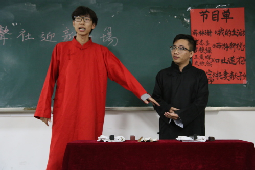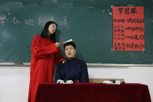 统相声《口吐莲花》。虽然是传统的相声节目,但是两位同学又结合了时事热点对相声进行了翻新。王同学以自己会戏法“口吐莲花”“日赚斗金”吸引史同学学艺,结果史欣然同学却当了人体锣鼓,请了半天神仙,才发现一切都是幌子。虽然是第一次上台表演相声,但是王晨晖同学稳重的台风、精湛的表演赢得了观众的一致好评。