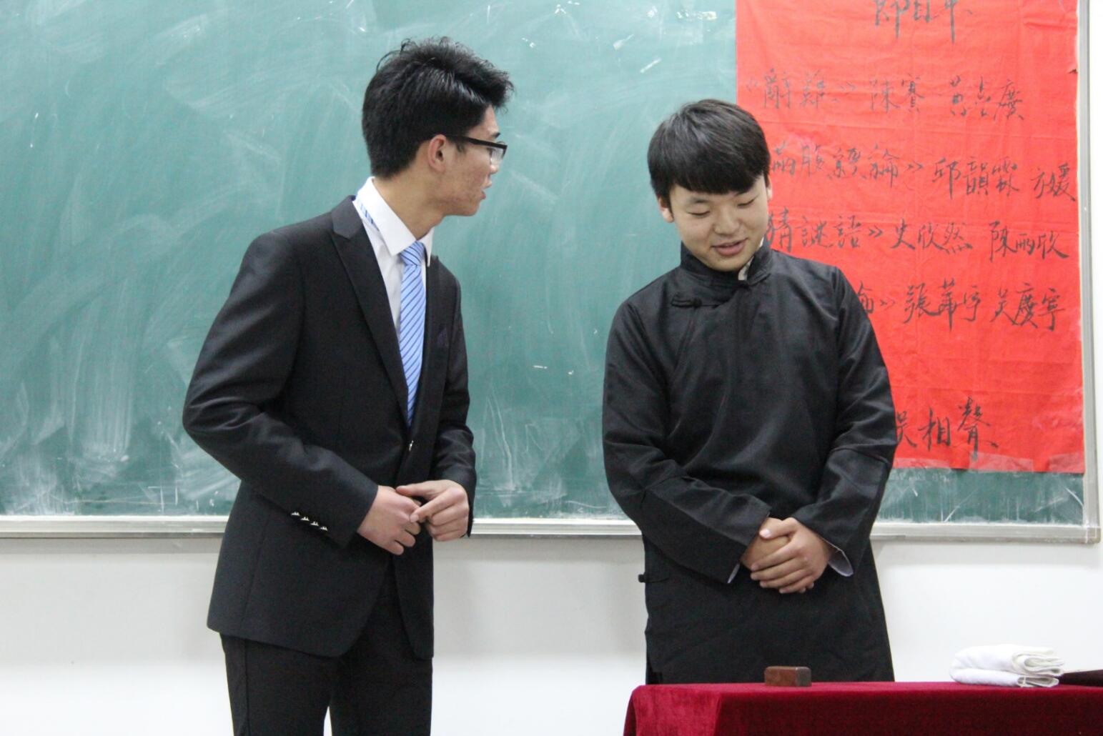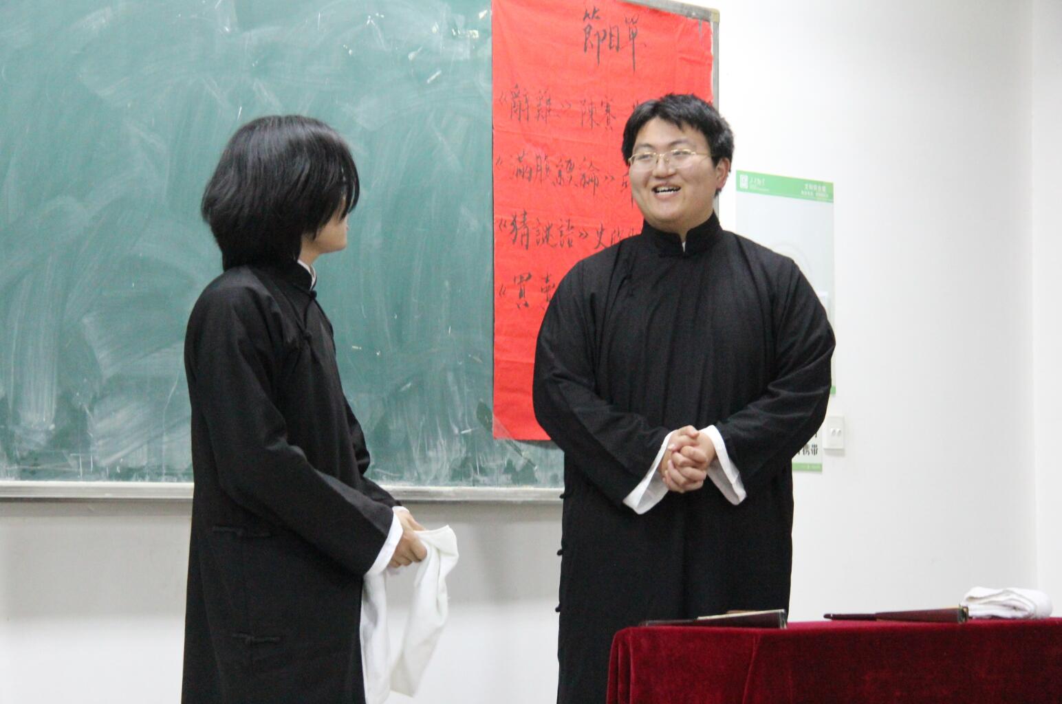 接着便是我们的老朋友吴庆宁和张华宇了,他们二位虽均来自17级,但经过了一学期的磨炼之后,台风稳健了不少,这一次默契的二人为我们带来的是《买卖论》。吴庆宁先是带着他远道而来的朋友去了苏州的小馆子吃了顿“王八”,在享受到不热情的服务后,开始怀念起了“勤行”。吴同学先是给我们列举了勤行怎么处理“苍蝇”的,要么忽悠顾客看“外星人”再迅速处理,要么把苍蝇吞进了肚子。后来又cosplay了一把卖鞋的和棺材铺的老板,可这热情的卖鞋套路加在棺材铺上,总觉得有股阴森奇怪的感觉,所以说做买卖还是要分场合,不能一概而论啊。