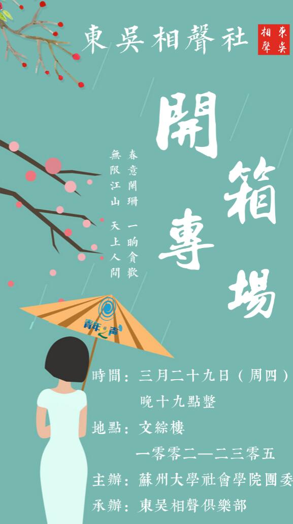 “春意阑珊,一晌贪欢。无限江山,天上人间”,天气渐渐回暖,东吴相声社迎来了本年度第一次专场演出,希望同学们能以最饱满的精神迎接新的学期。3月29日,相声社18年的开箱专场就开始了。