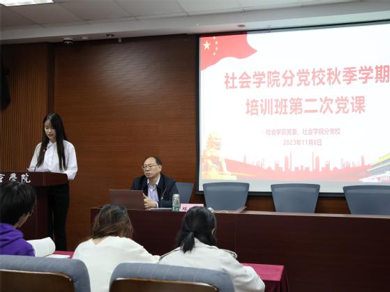 为深入学习贯彻习近平新时代中国特色社会主义思想和党的二十大报告中关于“中国式现代化”的重要内容,切实提高预备党员、发展对象及入党积极分子政治理论水平与党性修养,11月8日晚,社会学院分党校在院学术报告厅举办2023年秋季学期第二次主题党课。学院党委书记、分党校校长邓国林作《以中国式现代化全面推进中华民族伟大复兴》专题党课,学院专职组织员、分党校秘书李玲出席活动,分党校培训班全体学员及分党校工作人员参加。活动由2022级劳动与社会保障专业王靖仪同学主持。