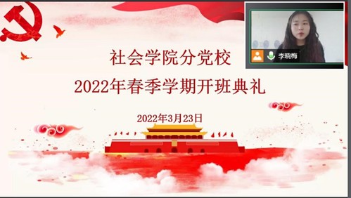 3月23日下午,社会学院分党校2022年春季学期开班典礼暨第一次党课活动在腾讯会议线上平台顺利举行。社会学院党委书记、分党校校长邓国林,学院党委副书记、副院长、分党校副校长朱今,学院分党校秘书李玲出席本次活动。学院第46期预备党员培训班、第67期党的基本知识培训班、第13期入党积极分子培训班全体学员及分党校全体工作人员参加本次活动。活动由学院分党校学生工作组织理事长李晓梅主持。