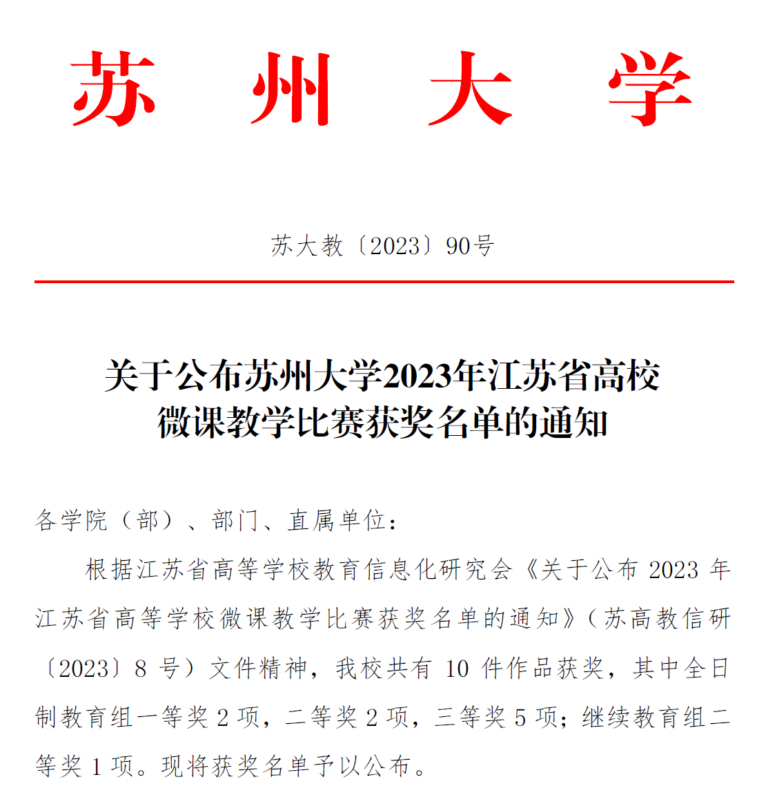 江苏省高校微课教学比赛由江苏省教育厅指导、江苏省高校微课教学比赛组委会主办,江苏省高等学校教育信息化研究会承办,旨在促进本科“双一流”建设,推进信息技术与教育教学深度融合,全面提升高校教师专业化水平和创新能力。我校此次共获得奖项10项,其中一等奖2项。